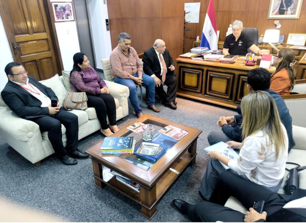 El presidente del Instituto Paraguayo del Indígena (INDI), Hugo Samaniego, acompañado por la gobernadora del departamento de Concepción, Liz Meza, y concejales departamentales, fue recibido por el ministro del Interior, Enrique Riera, en una reunión de trabajo desarrollada en la sede ministerial.