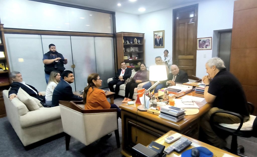 El presidente del Instituto Paraguayo del Indígena (INDI), Hugo Samaniego, acompañado por la gobernadora del departamento de Concepción, Liz Meza, y concejales departamentales, fue recibido por el ministro del Interior, Enrique Riera, en una reunión de trabajo desarrollada en la sede ministerial.